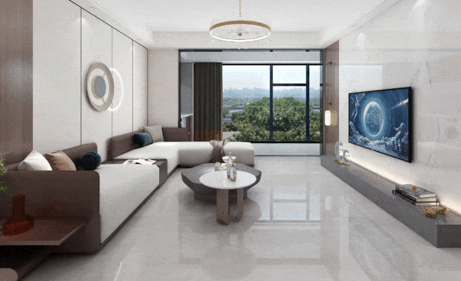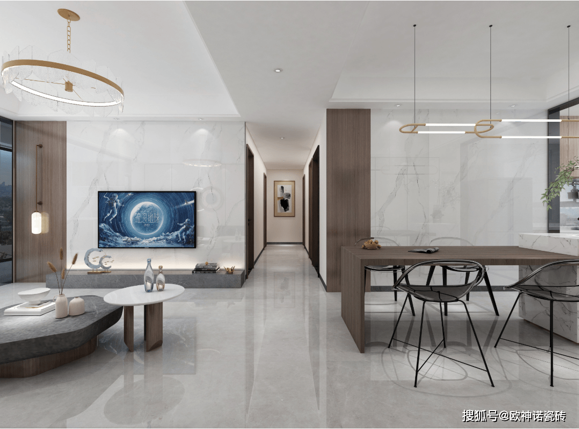 客廳,以灰色調(diào)為主,白色與金色穿插其中,相互映襯,900×1800mm、750×1500mm大規(guī)格的瓷磚分別應(yīng)用在墻面、地面,大規(guī)格的瓷磚讓空間突破限制得到延展,空間視野更開闊,配以細(xì)膩的紋理營(yíng)造**大氣的現(xiàn)代空間感。