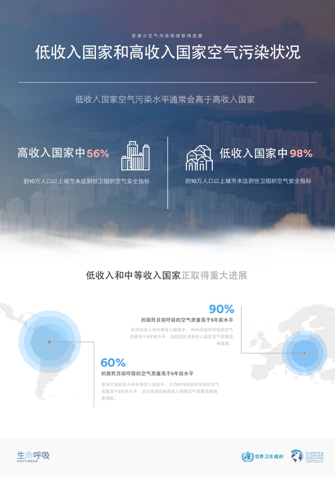 根據(jù)世衛(wèi)組織給出的數(shù)據(jù)統(tǒng)計,每年約有300萬例死亡與暴露于室外空氣污染有關(guān),而室內(nèi)空氣污染也同樣可以致命。將近90%的空氣污染相關(guān)死亡發(fā)生在低收入和中等收入國家,且近三分之二在世衛(wèi)組織東南亞區(qū)域和西太平洋區(qū)域。94%系由非傳染性疾病導(dǎo)致,尤其是心血管病、中風(fēng)、慢性阻塞性肺病和肺癌。空氣污染還增加嚴重急性呼吸道感染的風(fēng)險。